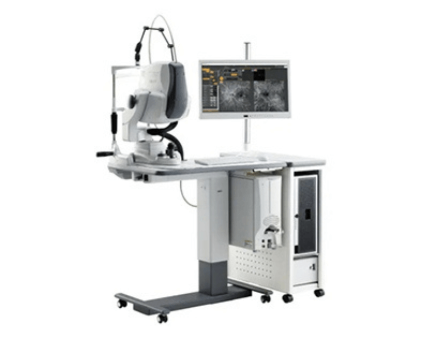 OCTに定評のあるトプコン社製の最上位機種のOCTです。OCTアンギオの画像もきれいに撮ることが出来、今まで点滴をして、薬剤を入れて行っていた眼底の血流の悪い部分が点滴や薬剤の負担なく行う事が出来る様になりました。