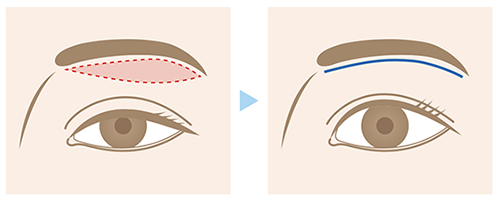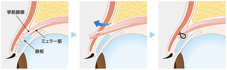 あらかじめ手術を行う事に問題がないか最もポピュラーな術式です。上眼瞼の皮膚を切開し、眼瞼を持ち上げる筋肉(眼瞼挙筋、ミューラー筋)を短縮し、まぶたを挙上させる手術を行います。同時に余剰皮膚を切除する場合もあります。