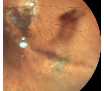 糖尿病や、網膜裂孔、網膜剥離等が原因となり硝子体に出血することがあります。下図出血により血管が見えにくくなっています。
