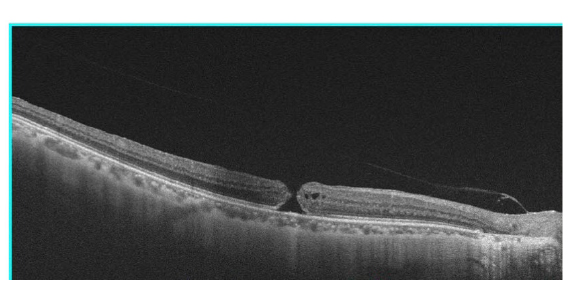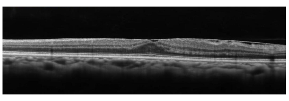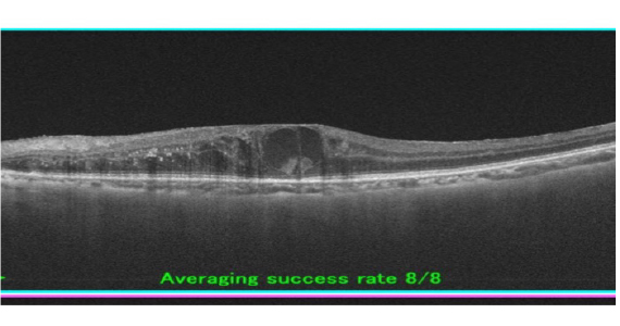 黄斑に孔が開くことがあります。ものを見る中心部分に孔があくので、ものがゆがんで見えたり、左右の物の大きさが違って見えたりします。両眼で見ると気づかない事もありますので見え方がおかしいと思ったら、左右それぞれで見てチェックしてください。OCTの検査で上の写真のように一発で診断が出来ます。治療は孔の開き具合にもよりますが基本は手術となります。手術は早ければ早いほど視力回復の可能性が高くなるので、ゆがみ等を感じたらすぐに眼科受診をして下さい。