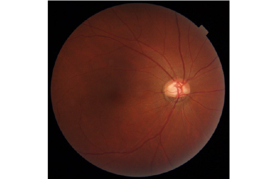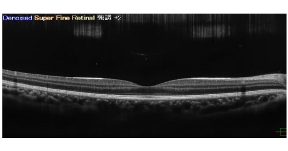 黄斑部分は神経の集まっている場所です。ここが少しでも傷むと視力障害が出ることがあります。正常の黄斑部分は上記のようになっており少しへこんでいます。