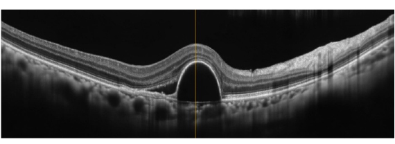 黄斑部分という物をみる大事な部分が、糖尿病や網膜の静脈が詰まること等により腫れてしまうことがあります。通常へこんでいる黄斑部分が上図のように腫れてしまっています。